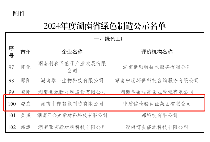 2024年9月27日,湖南省工业和信息化厅公示了《2024年度湖南省绿色制造体系示范单位》, 湖南中部智能制造有限公司获“湖南省绿色工厂”称号。